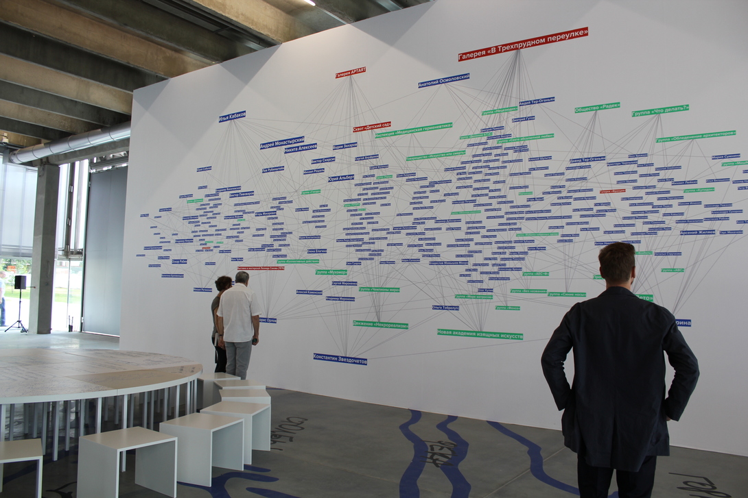 Russian modern artists' network visualization, made for Garage Museum of Contemporary Art, summer 2015. Size 15x5 meters. Data source: Garage Museum. Tools: Gephi, Adobe Illustrator
